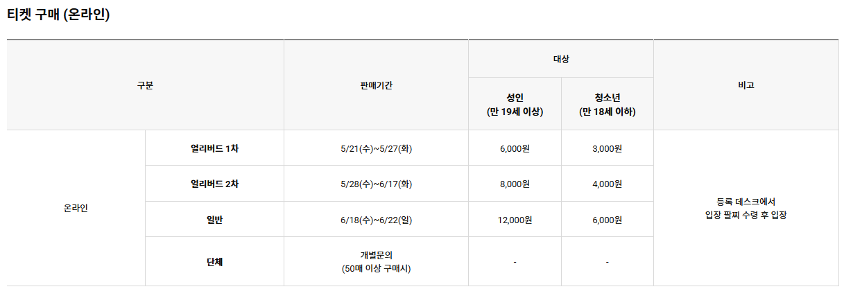 만 6세 이하 아동, 장애인, 국가유공자는 관련 증빙을 제시하면 무료 입장이 가능하니 참고하시기 바랍니다. 합리적인 관람을 원하신다면 얼리버드 기간 예매를 추천드립니다.