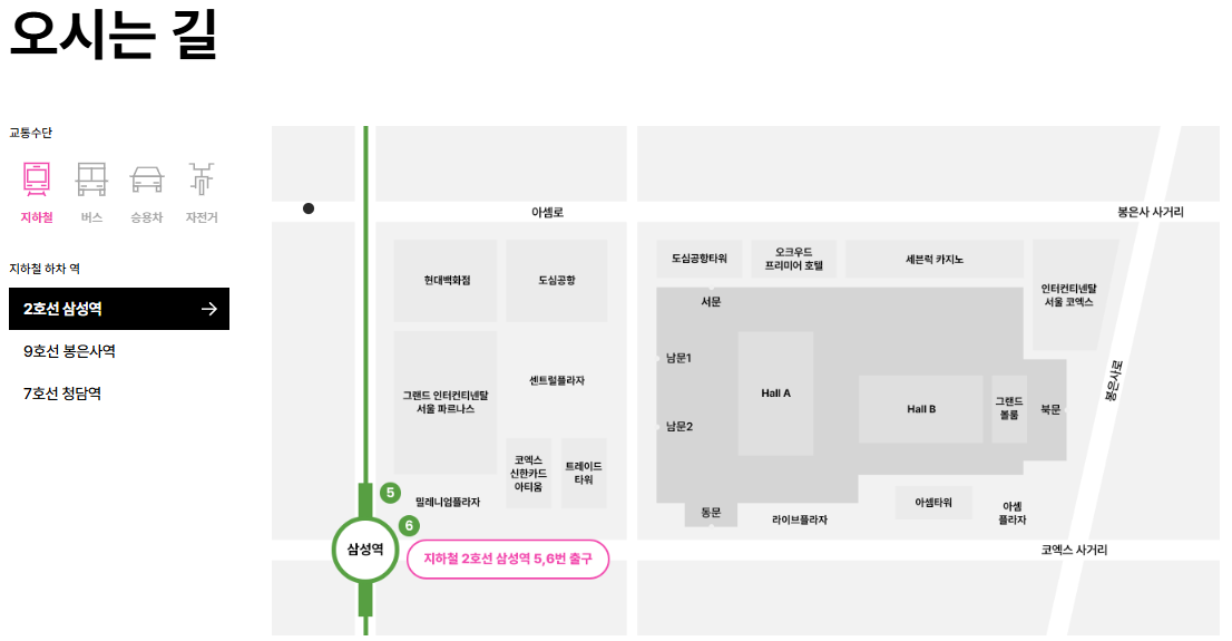 먼저 지하철을 이용하실 경우, 가장 빠르고 편리한 방법은 2호선 삼성역 5번 출구를 이용하는 것입니다. 해당 출구는 코엑스와 바로 연결되어 있어, 우천 시에도 외부로 나가지 않고 실내 통로를 따라 전시장 입구까지 이동할 수 있습니다.