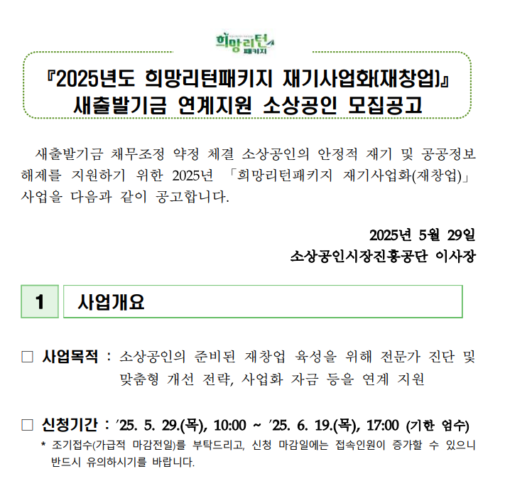 희망리턴패키지는 중소벤처기업부가 폐업 또는 폐업 예정 소상공인의 ‘두 번째 출발’을 지원하기 위해 마련한 종합 프로그램입니다.