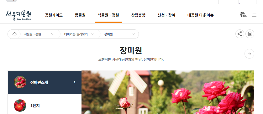 특히나 장미원은 41,925m2의 넓은 규모를 자랑하며, 100여 종의 다양한 장미 45,000주가 심겨 있어 화려하고 다채로운 풍경을 선사합니다.