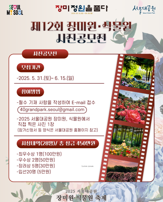 서울대공원 장미원축제의 특별한 행사 중 하나는 ‘2025 서울대공원 장미원 사진공모전’입니다. 이 공모전은 축제를 찾은 모든 이들에게 열린 참여의 기회를 제공합니다.