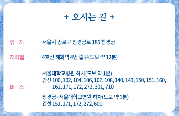 창경궁은 4호선 혜화역, 3호선 안국역 등 여러 지하철역에서 도보로 접근할 수 있습니다. 버스 노선도 다양하게 연결되어 있어 대중교통만으로도 무리 없이 행사장에 도착하실 수 있습니다.