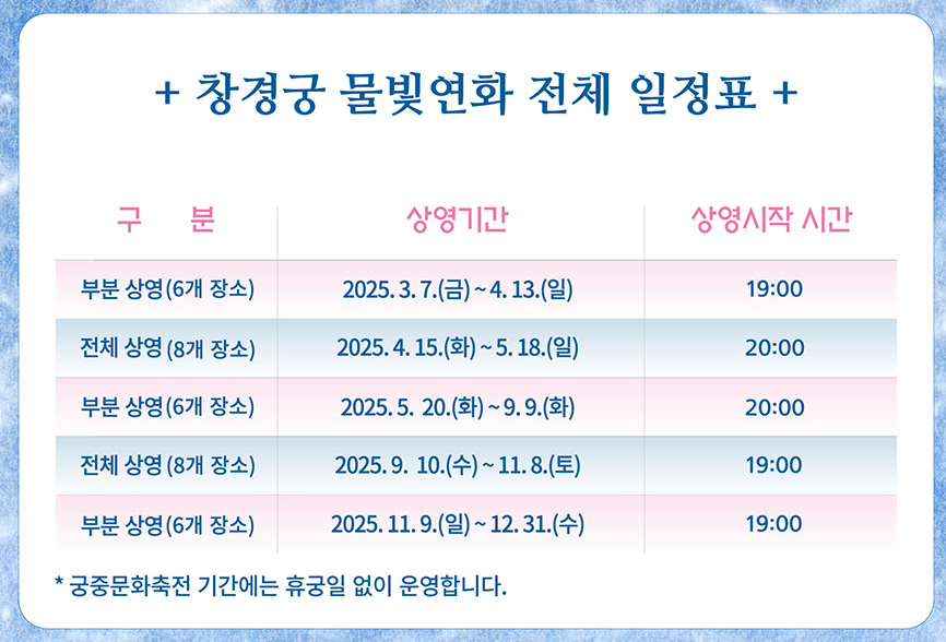 2025년 창경궁 물빛연화는 3월 7일부터 12월 31일까지 상시 운영되며, 휴궁일인 월요일을 제외하고 매일 저녁 진행됩니다.