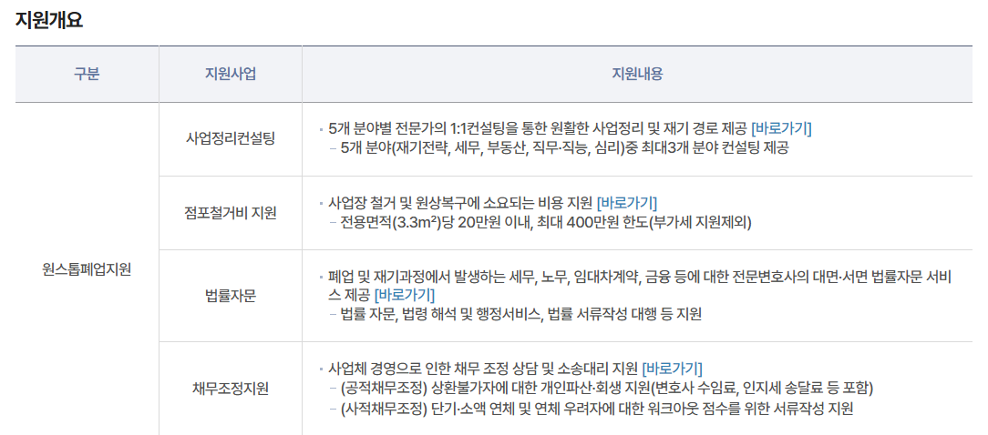 가장 큰 부담으로 꼽히는 점포 철거비는 전용면적 3.3m2당 8만 원씩, 최대 400만 원까지 지급됩니다. 이외에도 폐업 절차와 세무, 부동산 등 복잡한 문제를 해결할 수 있도록 최대 3개 분야의 사업정리 컨설팅이 제공됩니다.