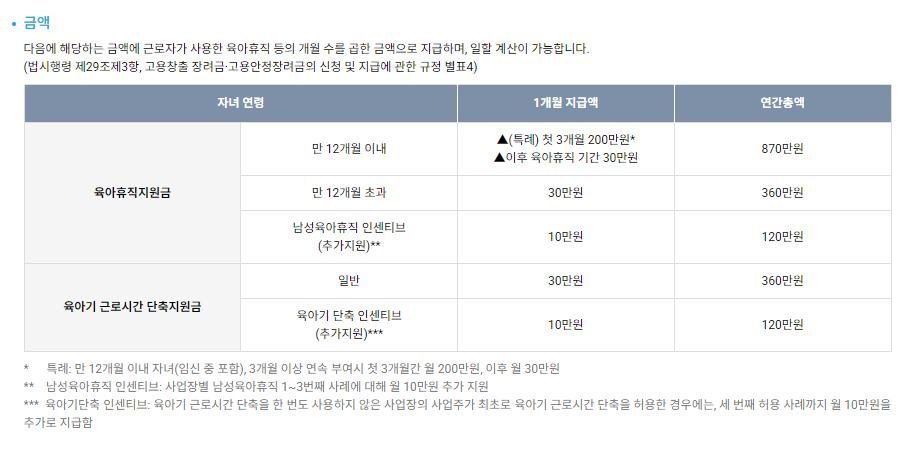 이 외에도 근로자가 육아휴직을 마친 뒤 6개월 이상 계속 근무하는 경우, 추가로 “고용유지 인센티브” 명목의 지원금이 지급될 수 있습니다.